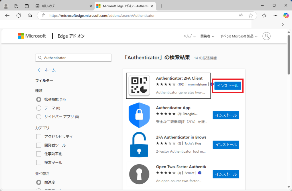 4. 「Authenticator: 2FA Client」横のインストールボタンを選択します。