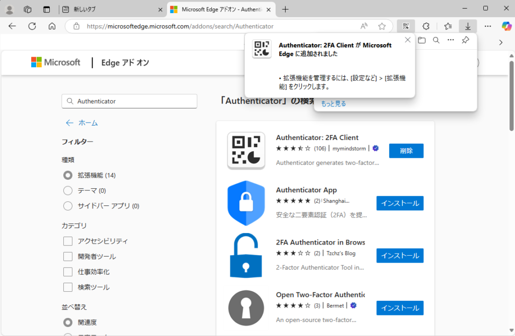 6. 「Authenticator: 2FA ClientがMicrosoft Edgeに追加されました」と表示されたらインストール完了です。