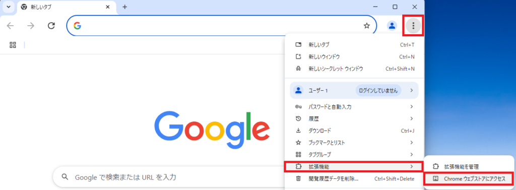 1. 画面右上の「...」を選択し、「拡張機能」→「Chromeウェブストアにアクセス」を選択します。