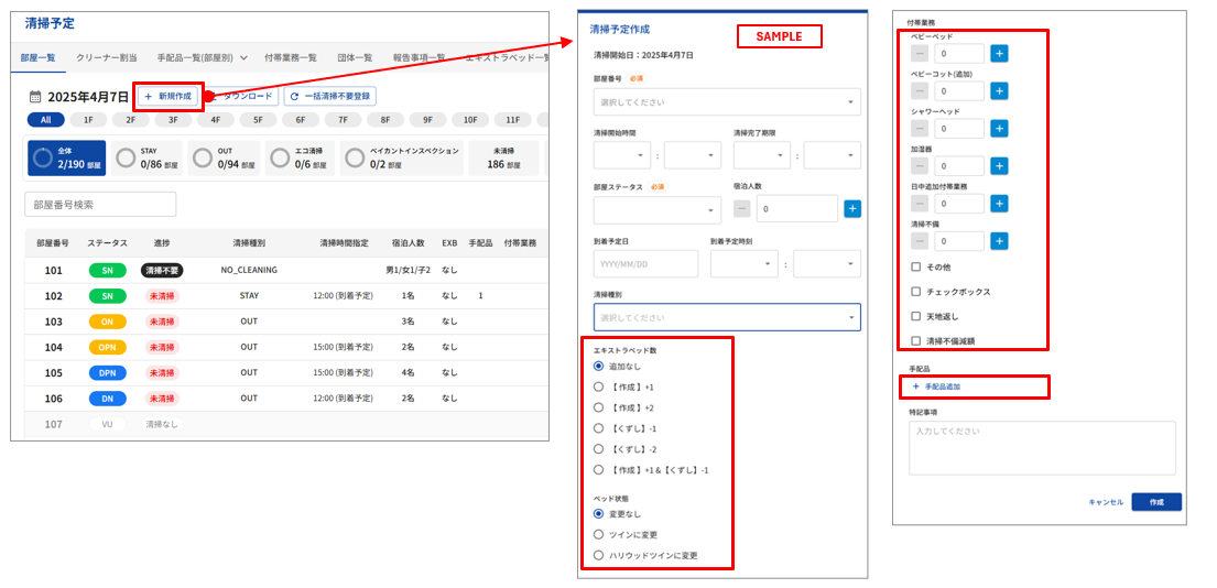 清掃予定(OUT清掃、STAY清掃)はないが、手配品・付帯業務の作業が必要な場合は清掃種別を空白にして手配品・付帯業務のみ設定してください