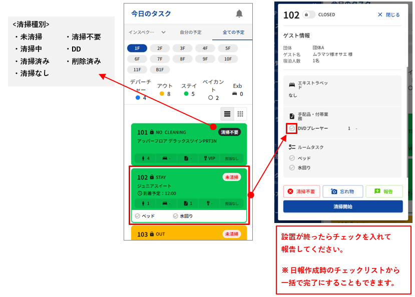 今日のタスク画面、もしくは清掃予定画面から詳細画面を開き、手配品・付帯業務の項目にチェックを入れることで、設置報告ができます。