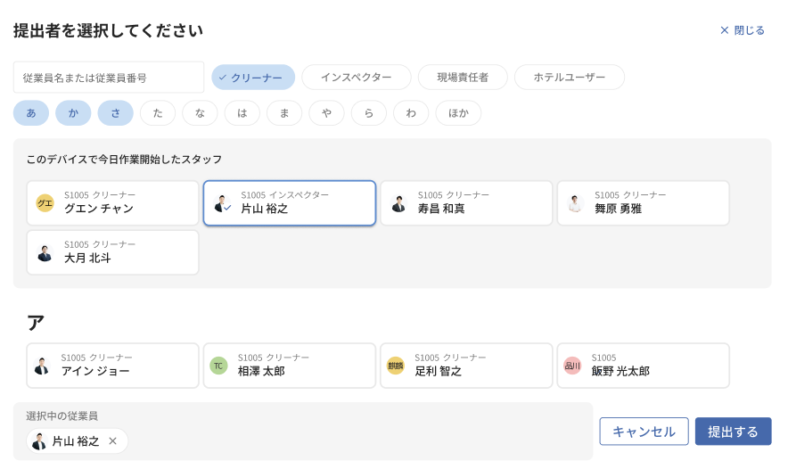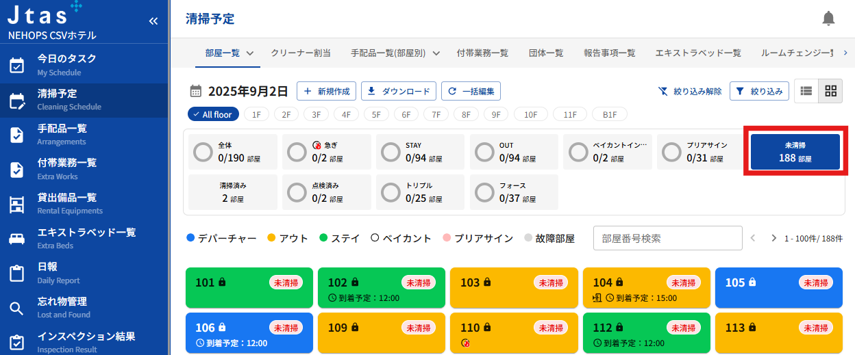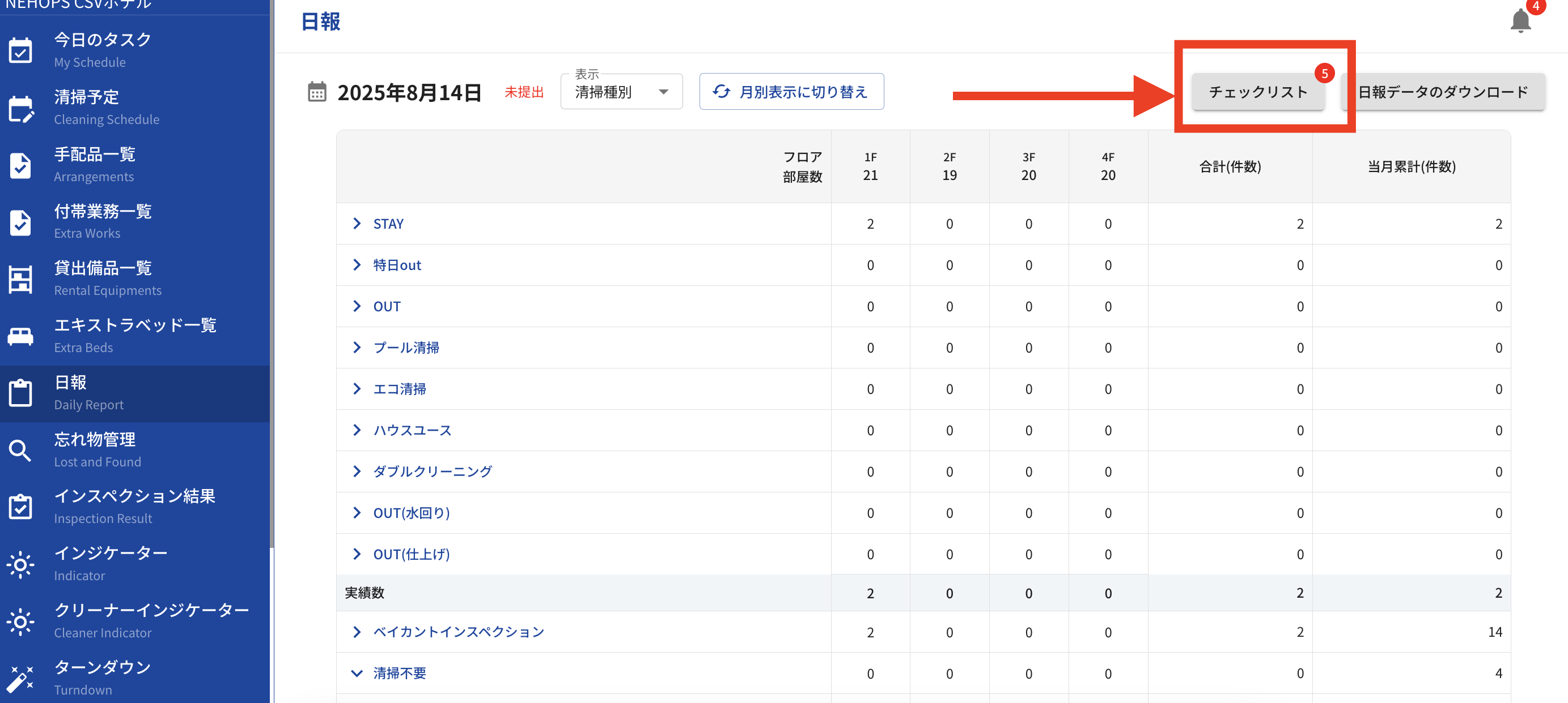 ゚キストラベッドず付垯業務はチェックリストにチェックが入っおいれば日報にカりントされたす。䞋図は枅掃予定画面ですが、他にも、今日のタスク画面、手配品䞀芧画面、付垯業務䞀芧画面からチェックを入れるこずが可胜です。