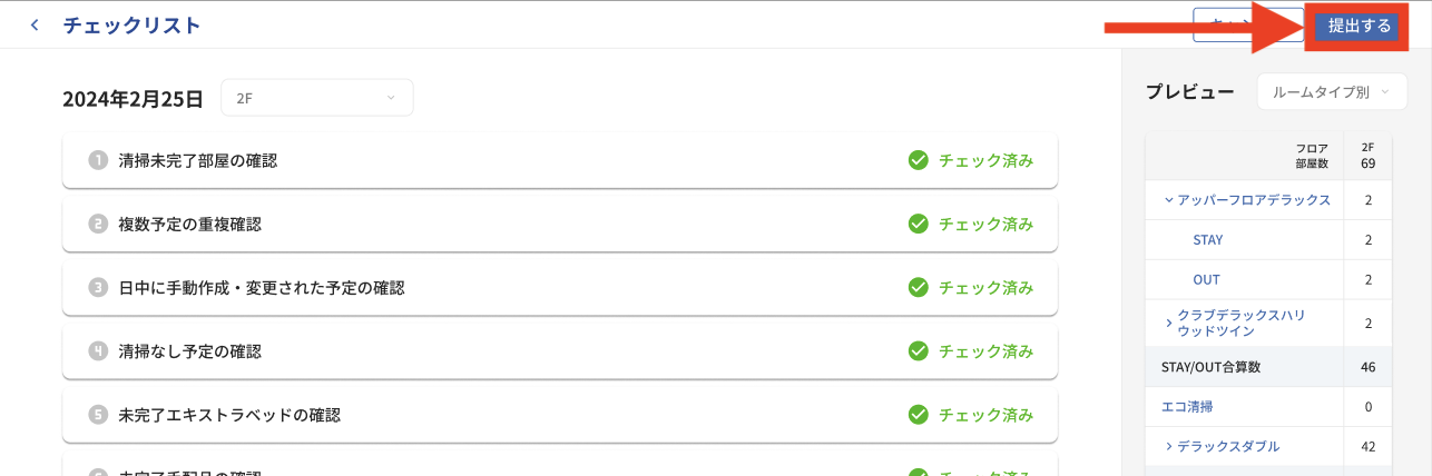 チェックリスト画面の右䞊より[提出]するず、枅掃実瞟が確定したずいう圢になりたす。