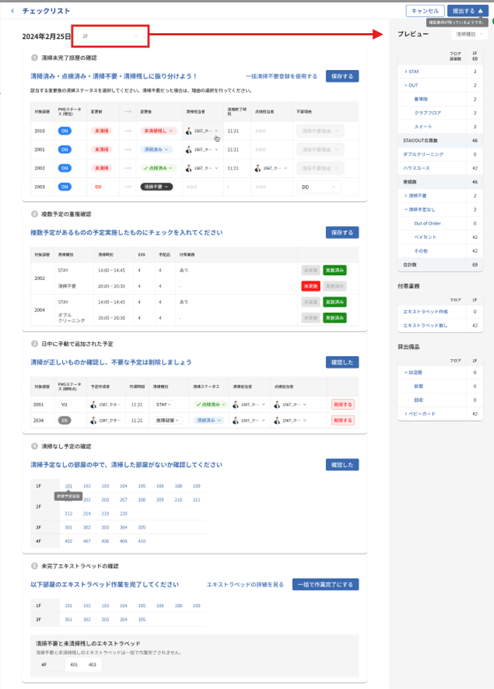 ※チェックリストの日付の右隣りにあるフロアを遞択するず、日報のプレビュヌが衚瀺され、チェックしながら実瞟を確認するこずができたす。