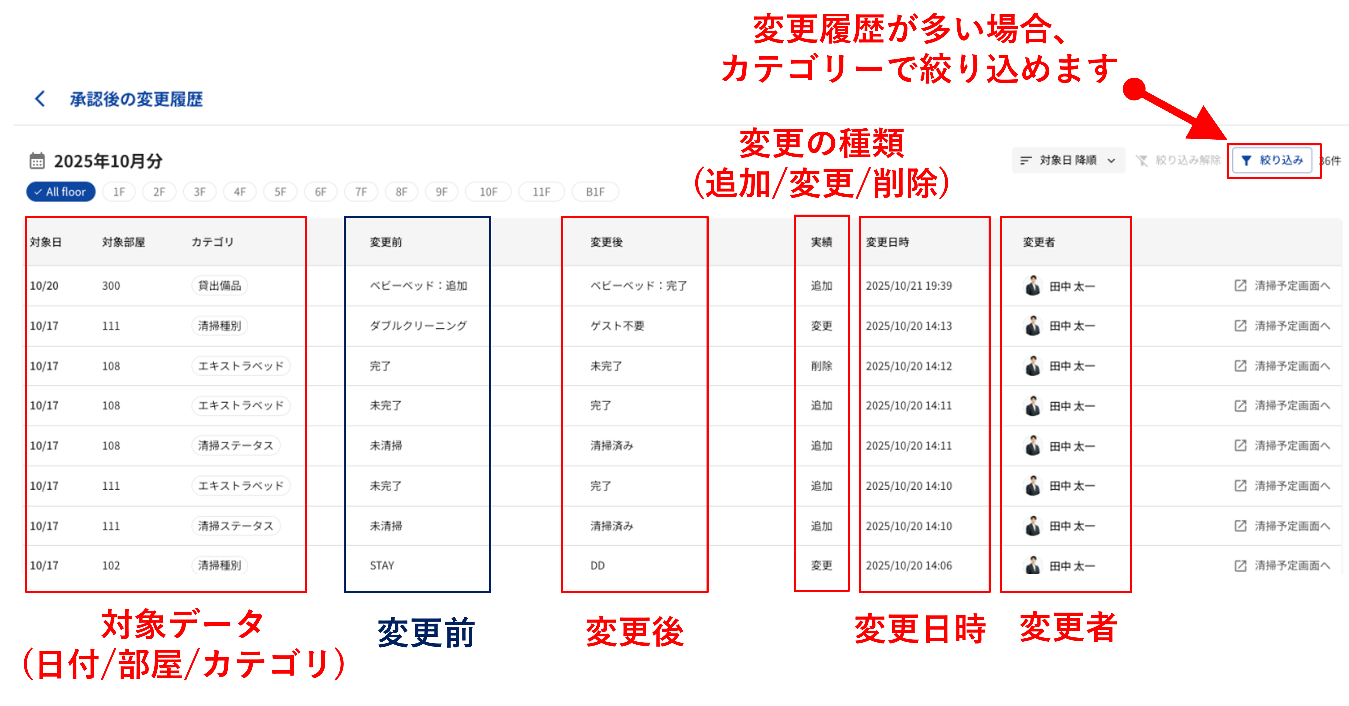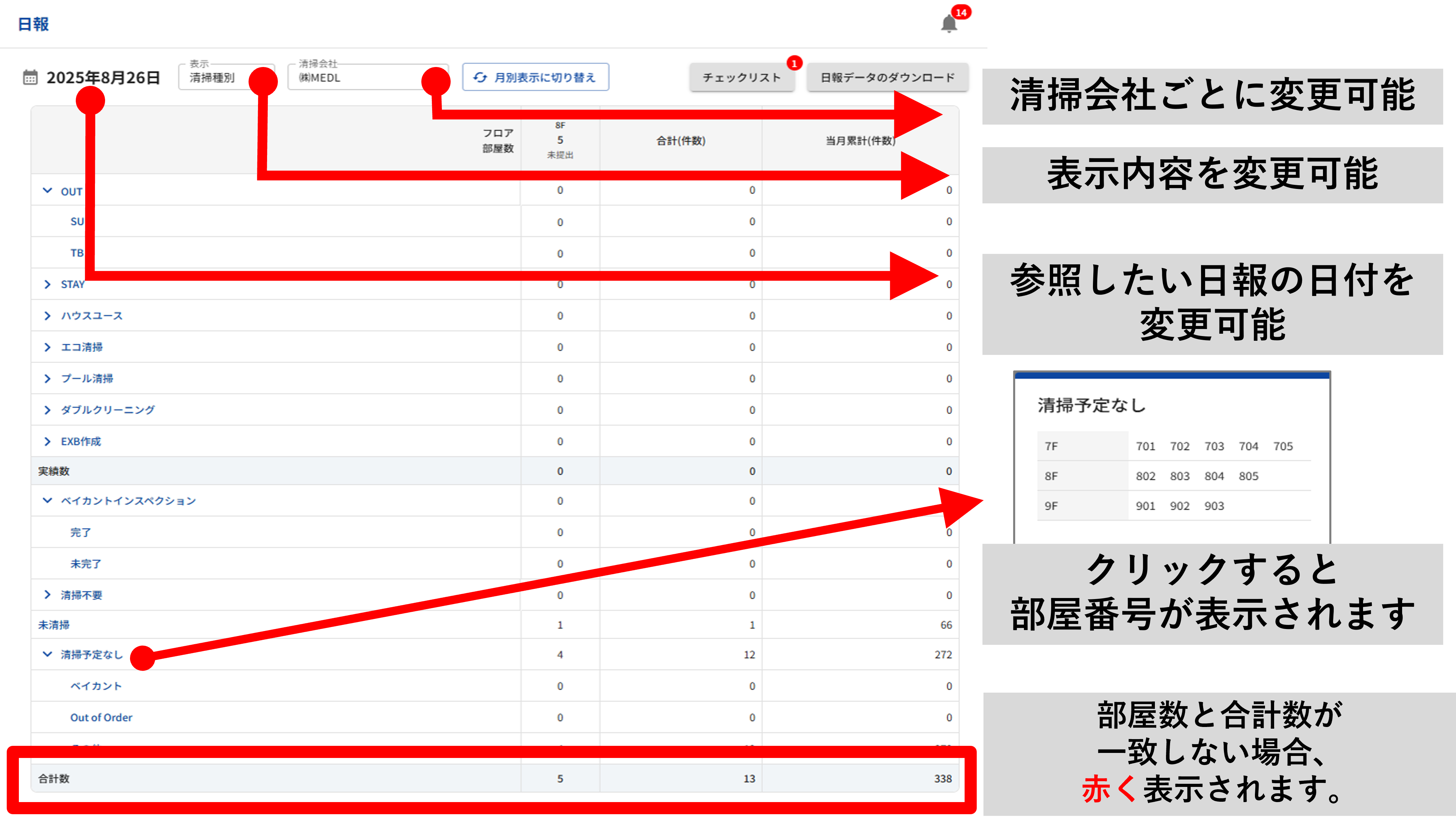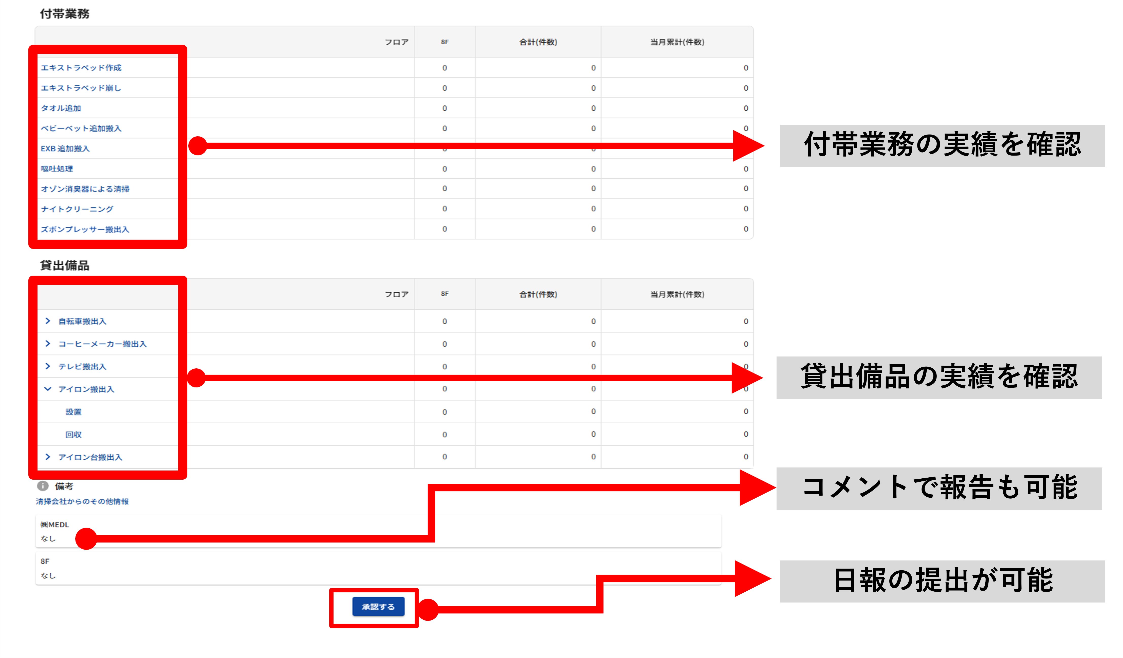 枅掃実瞟、゚キストラベッド、付垯業務の実瞟が日毎に確認できたす。
