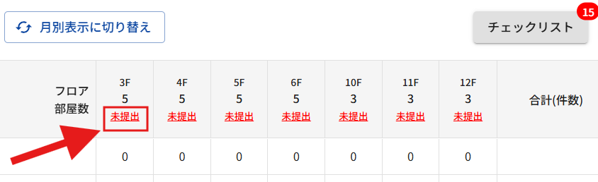 日報画面の【未提出】をクリックするず、フロアごずのチェックリストが開きたす。