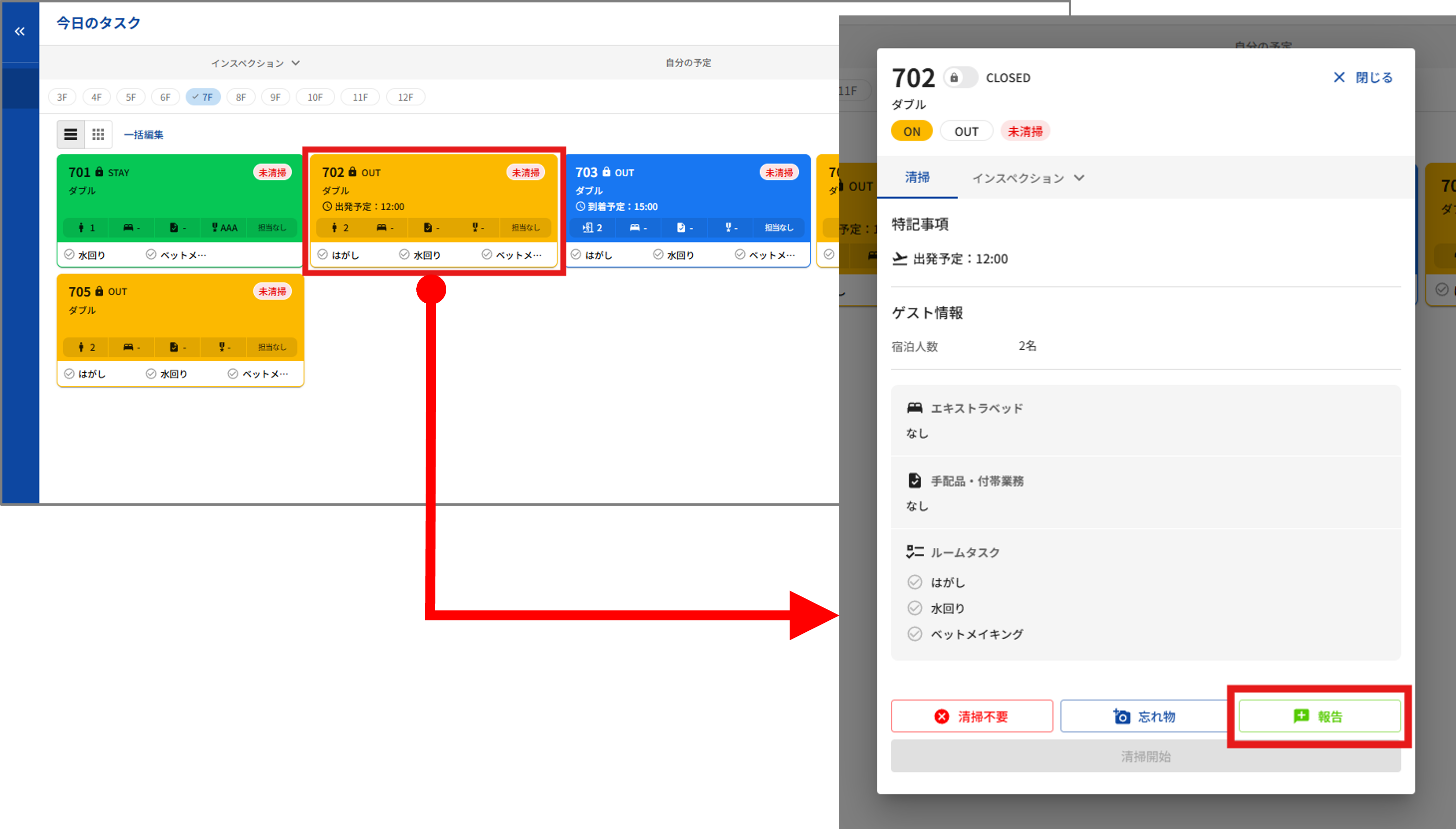 「今日のタスク」画面から変更したい部屋をクリックし、[+報告]をクリックします。