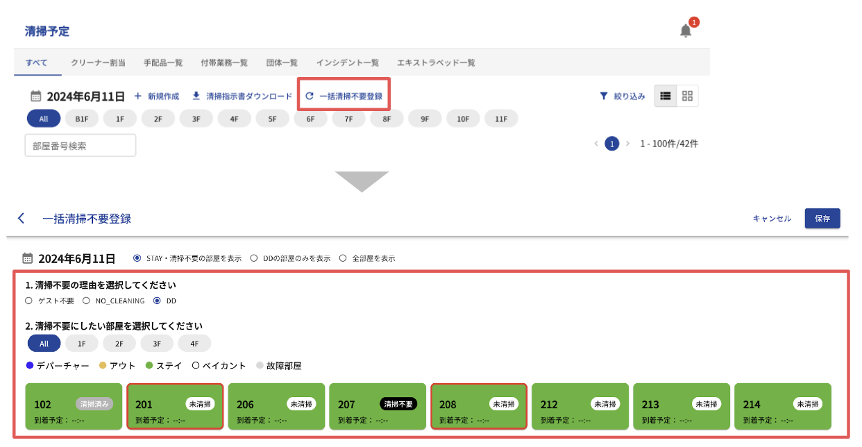 複数の部屋をまとめて清掃不要登録を行うことができます。
