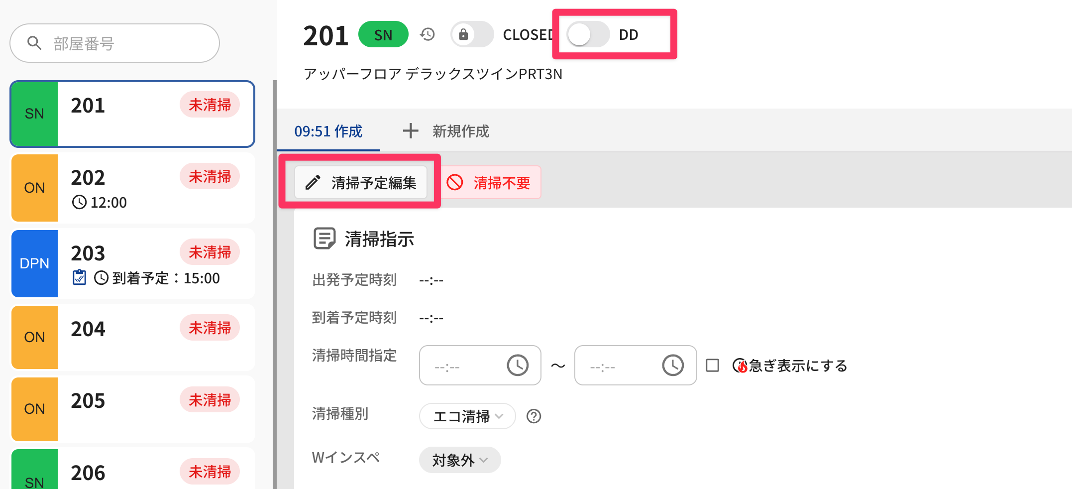 朝チェックした際に、部屋がDDだった場合、DDの一時設定をオンします(下図①)
