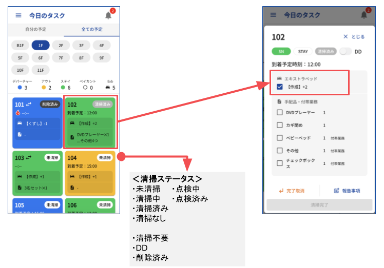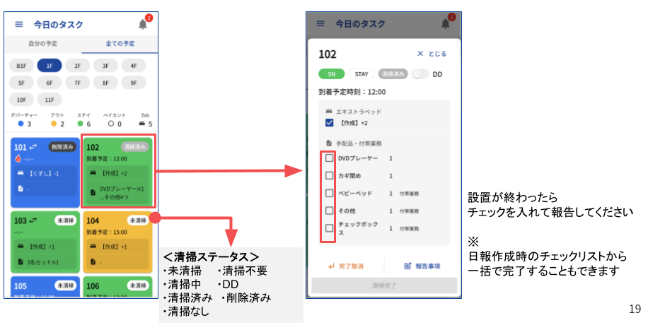 仿¥ã®ã¿ã¹ã¯ç»é¢ããããã¯æž æäºå®ç»é¢ãã詳现ç»é¢ãéããæé åã»ä»åž¯æ¥åã®é ç®ã«ãã§ãã¯ãå ¥ããããšã§ãèšçœ®å ±åãã§ããŸãã
