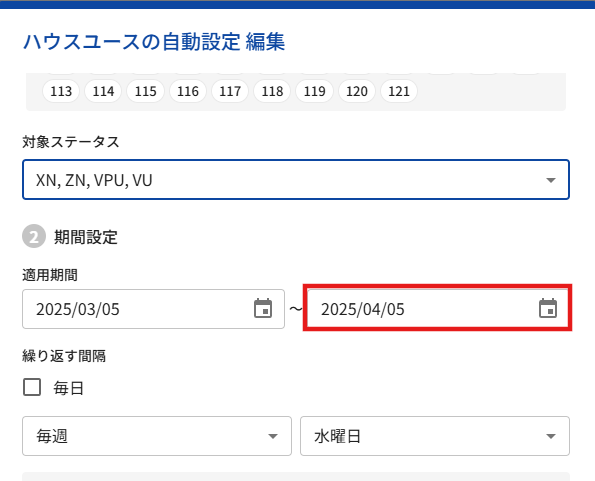 é©çšæéã®çµäºæ¥ã«çµäºäºå®æ¥ãå ¥åããŸããïŒâ» ãã®ä»ã®èšå®ã¯äžèšãåç §ïŒ