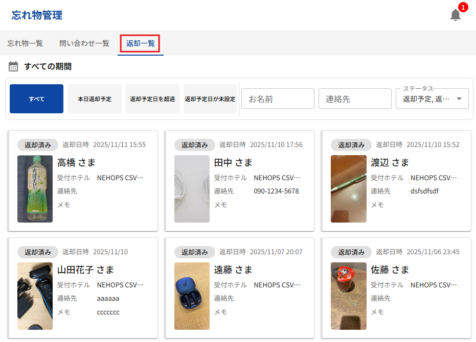 è¿åŽãããå¿ãç©ã¯ãè¿åŽäžèЧã®ã¿ãã«ãŠç¢ºèªã§ããŸãã