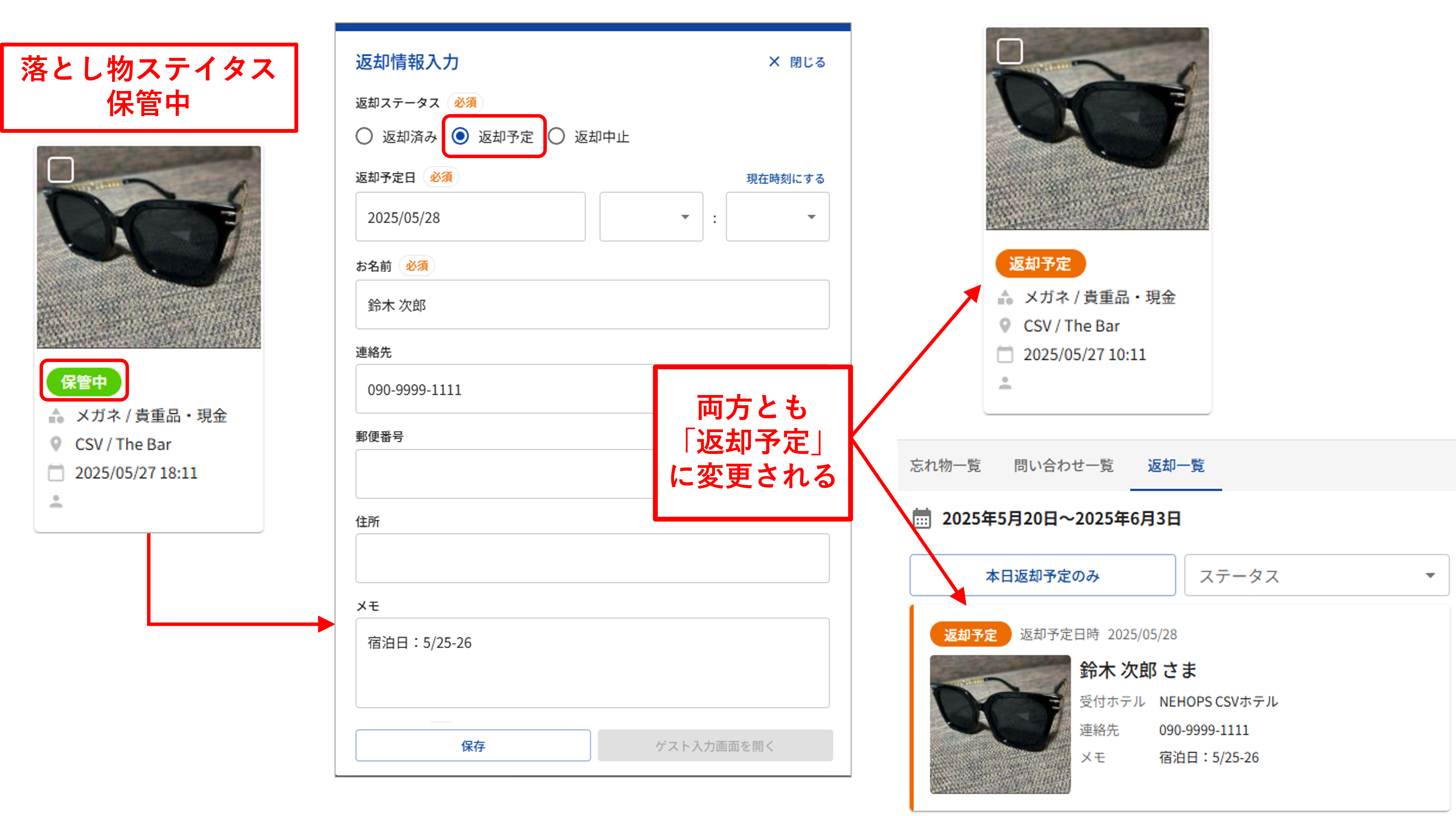 今後:返却ステータスを変更すると、それに合わせて関連付けられた忘れ物のステータスも自動的に同じステータスに変更される