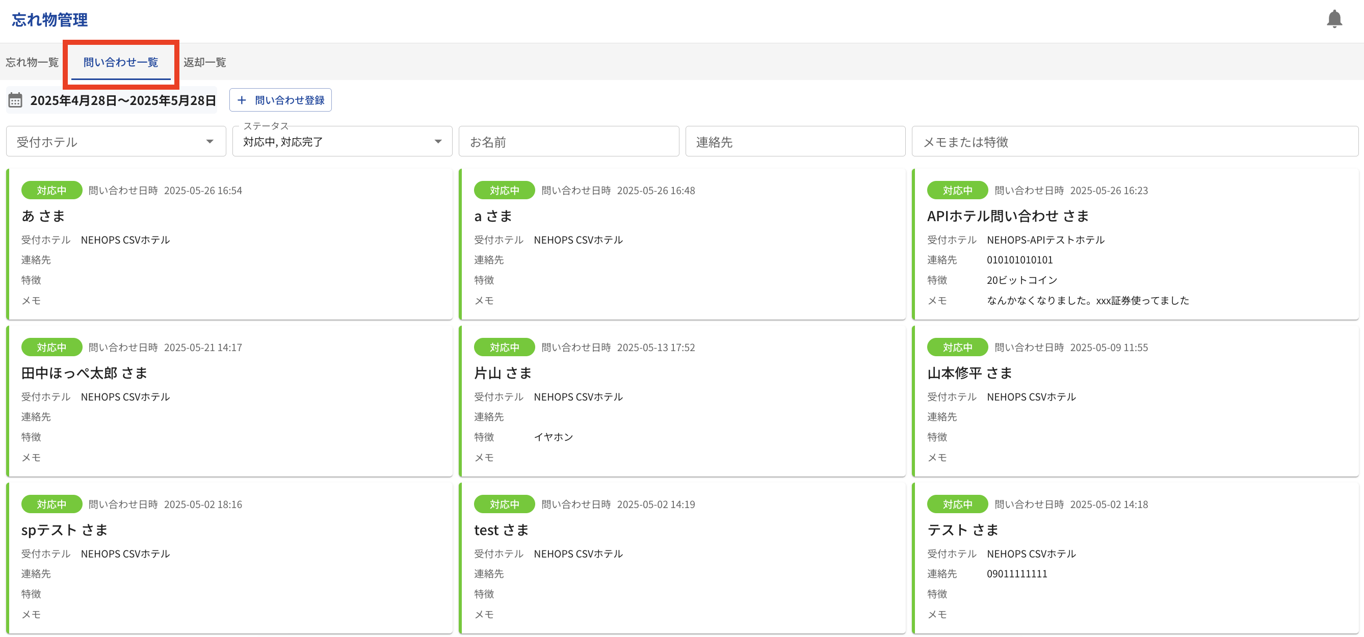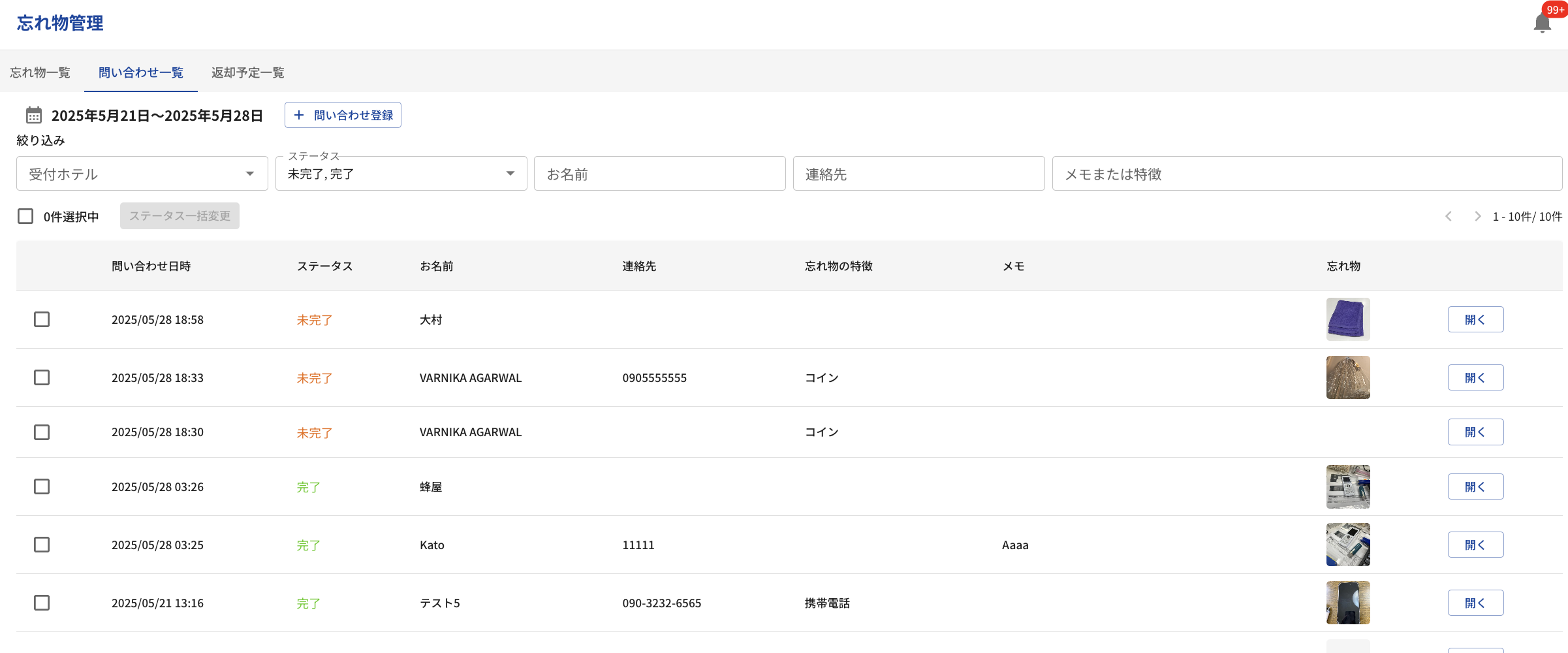 問い合わせ一覧:問い合わせ履歴と返却済みの忘れ物を表示