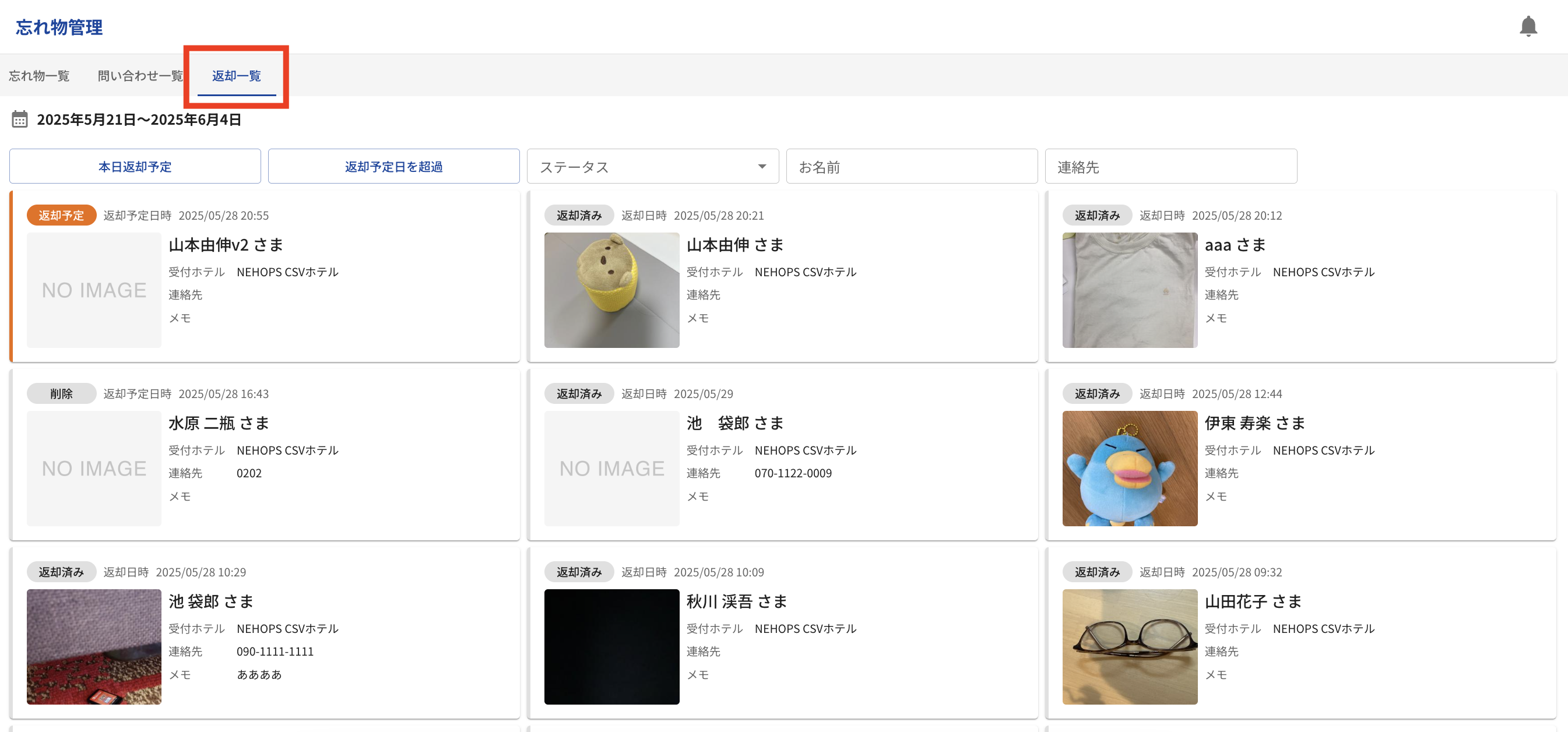 返却一覧:返却予定の忘れ物 と 返却済みの忘れ物を表示