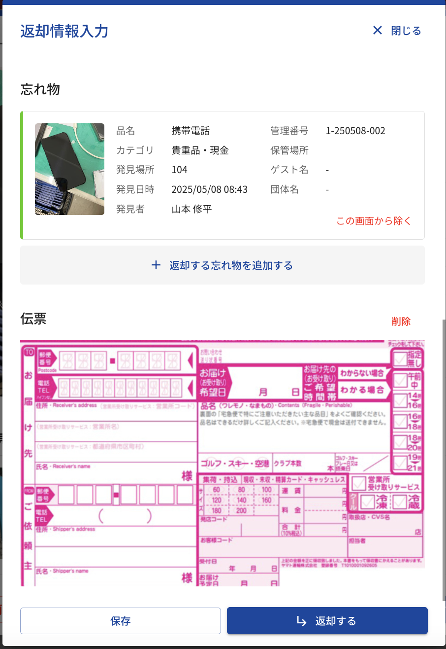 例)返却する忘れ物を選択した後に出る「返却情報入力」画面