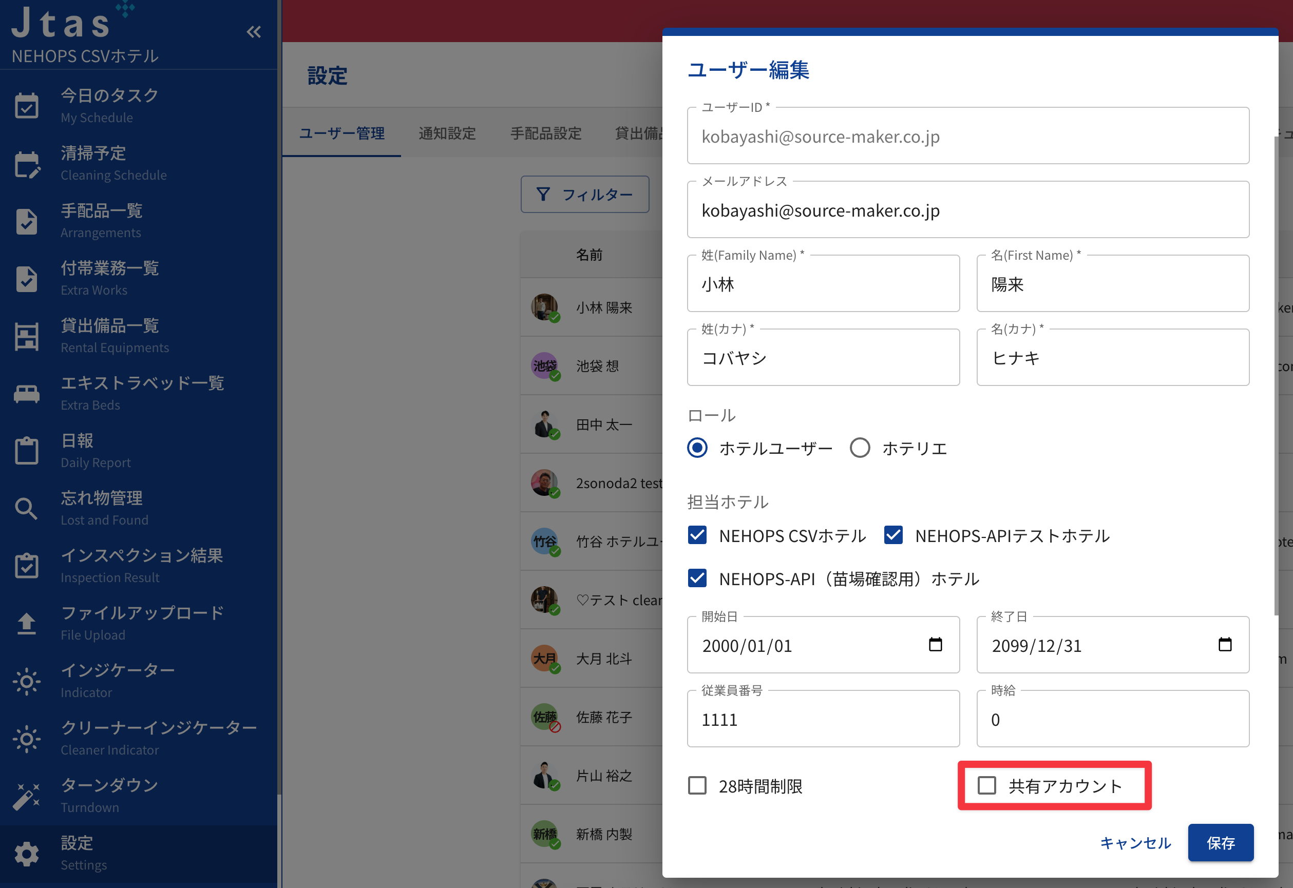 共有アカウントとは、ユーザー編集画面の共有アカウントのチェックのことです。