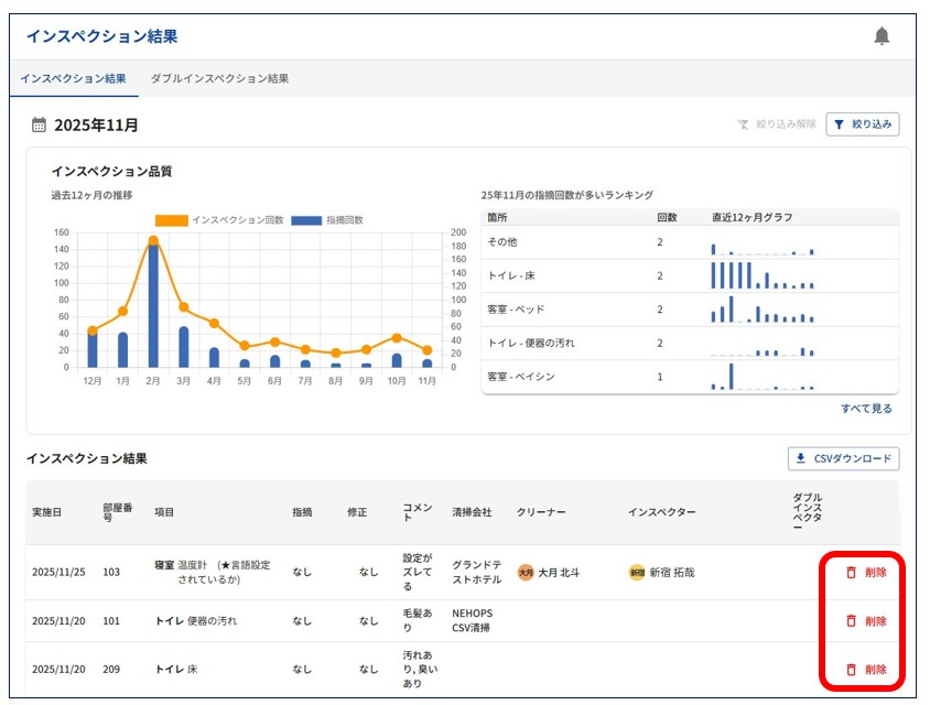 これまではインスペクション結果を削除することはできませんでしたが、今回の機能改善で試験的に行ったインスペクション結果や誤って実施してしまった別の部屋のインスペクション結果を削除できるようになりました。