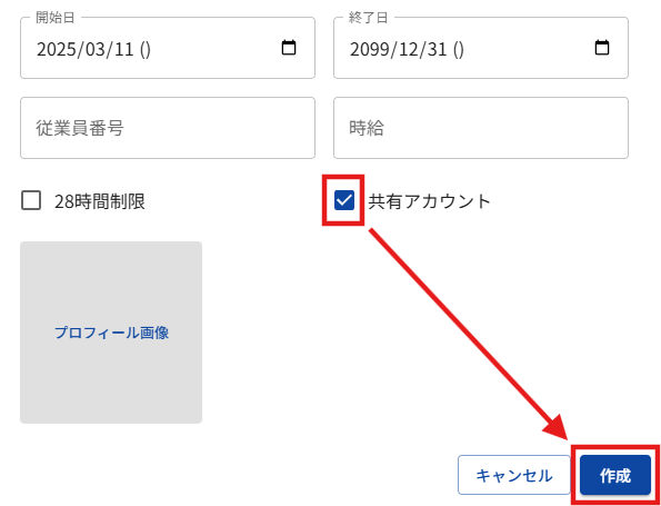 登録したい情報を入力後、「共有アカウント」にチェックを入れ、登録します。