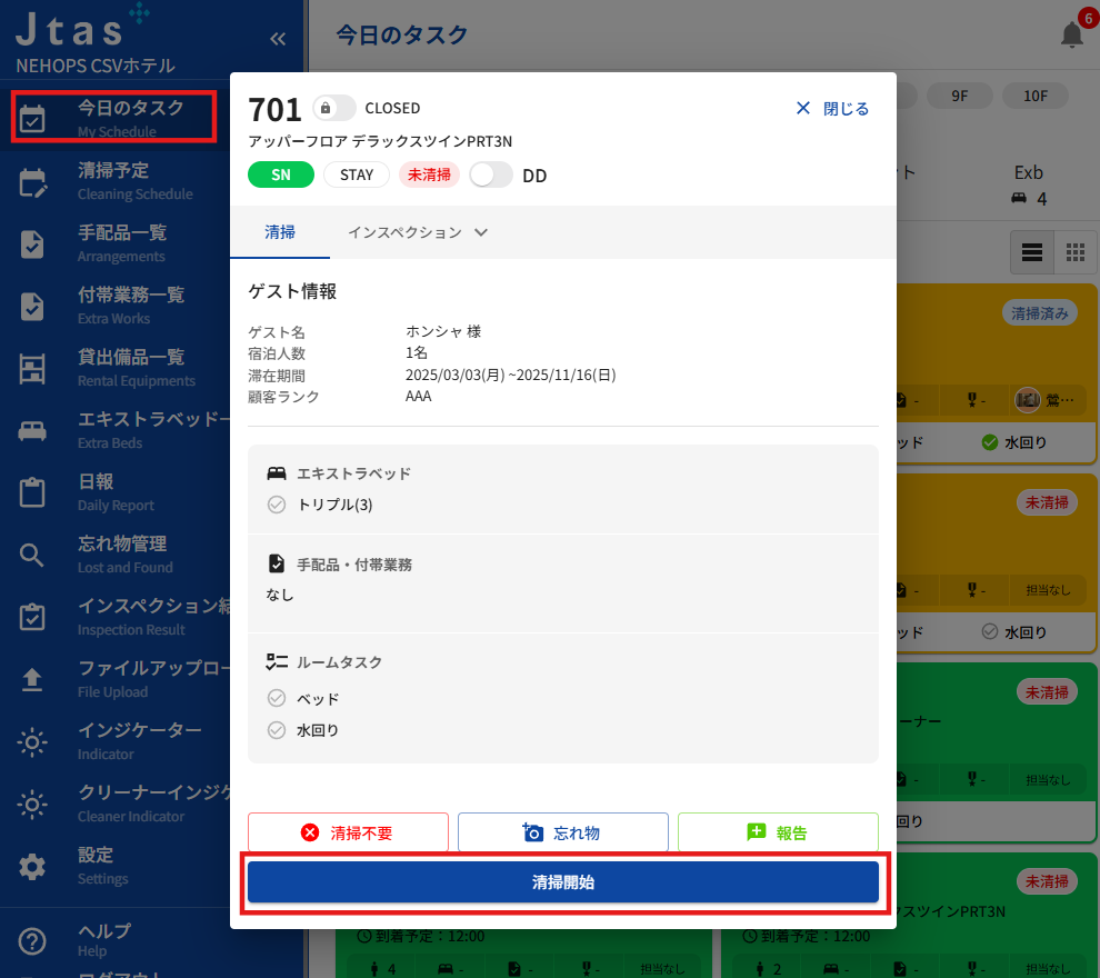 「今日のタスク」画面>作業予定の客室を選択し、「清掃開始」を選択します。