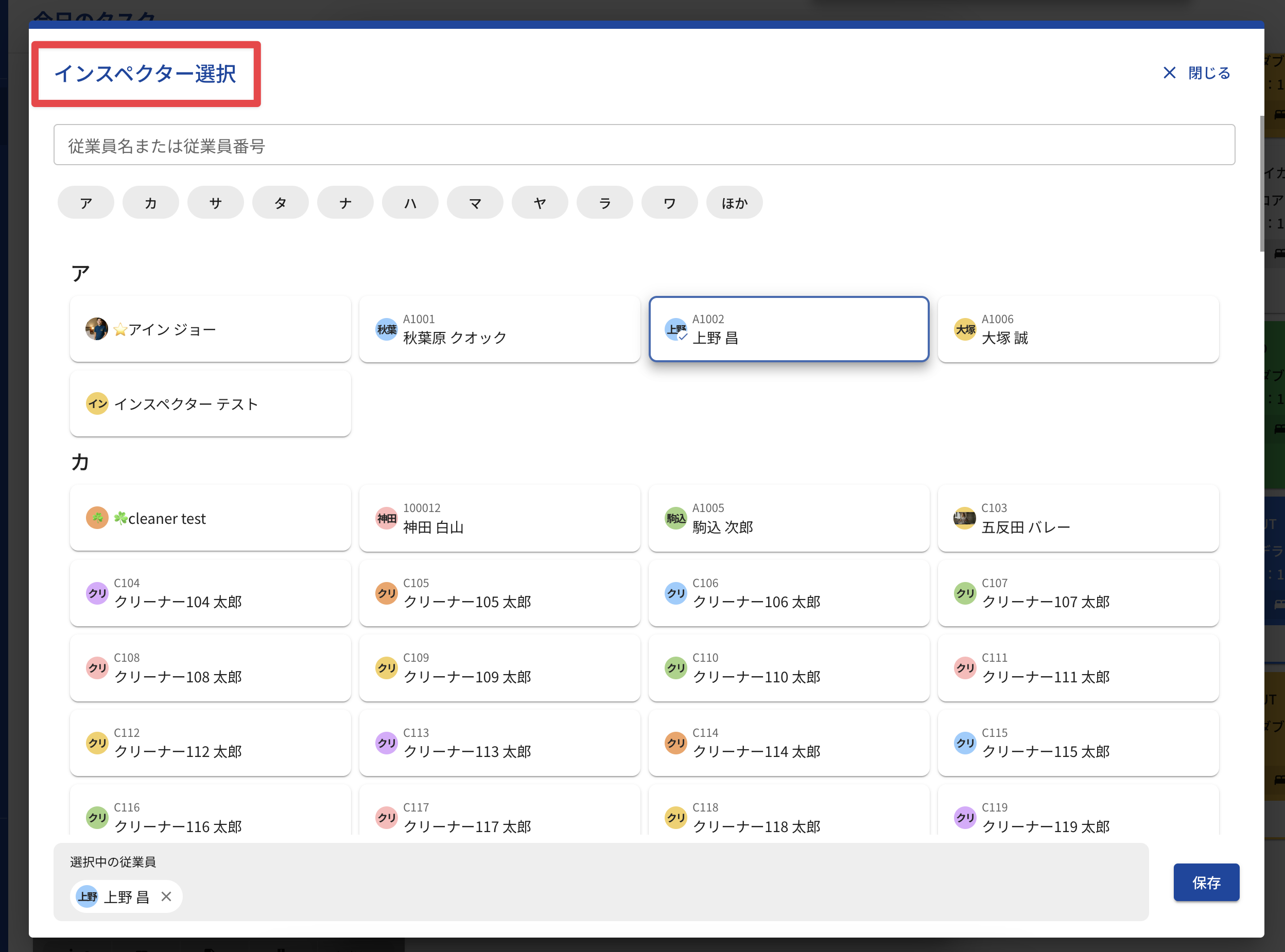 1つの端末を共有して複数人で使用している場合に、クリーナーの選択に加えて、インスペション実施者(インスペクター)を割り当てることができます。