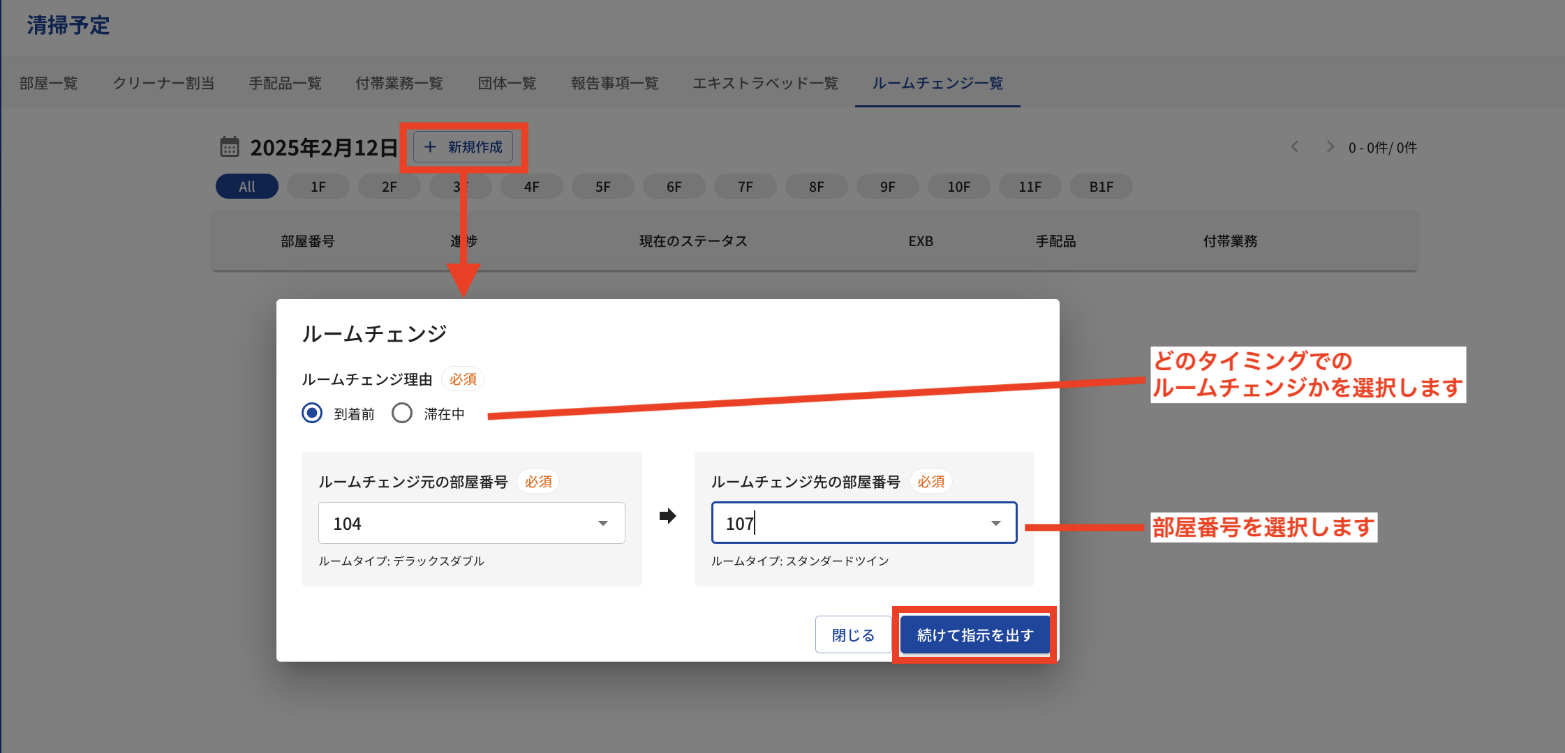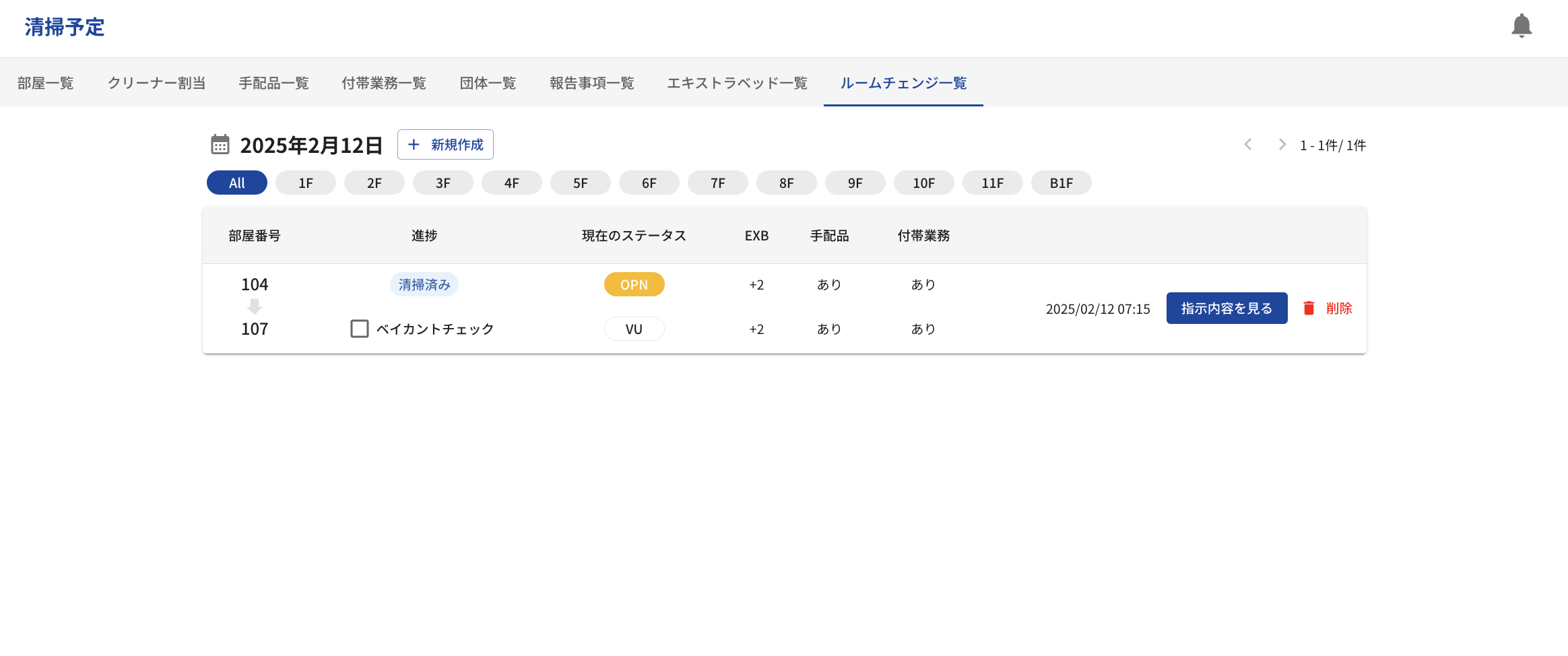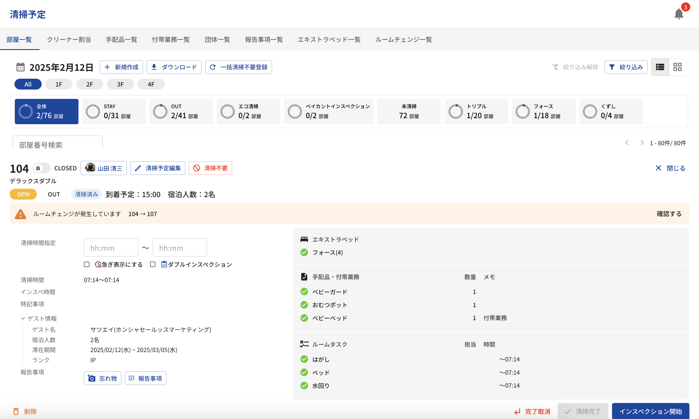 『清掃予定』画面のルームチェンジから行います。