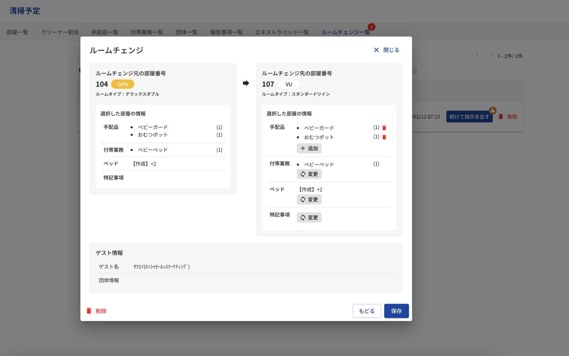 チェンジ元の部屋清掃、チェンジ先の手配品情報の設定を行います