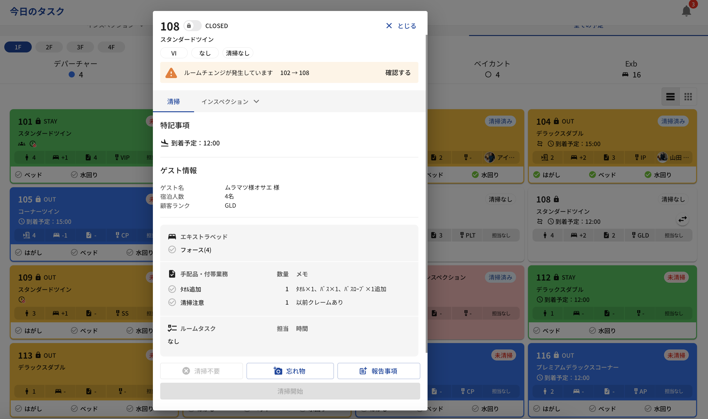 ・『今日のタスク』・『清掃予定』画面のチェンジ元・チェンジ先の部屋の詳細予定にてルームチェンジがあったことが確認できます