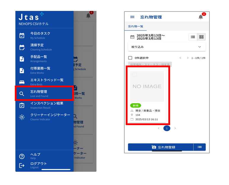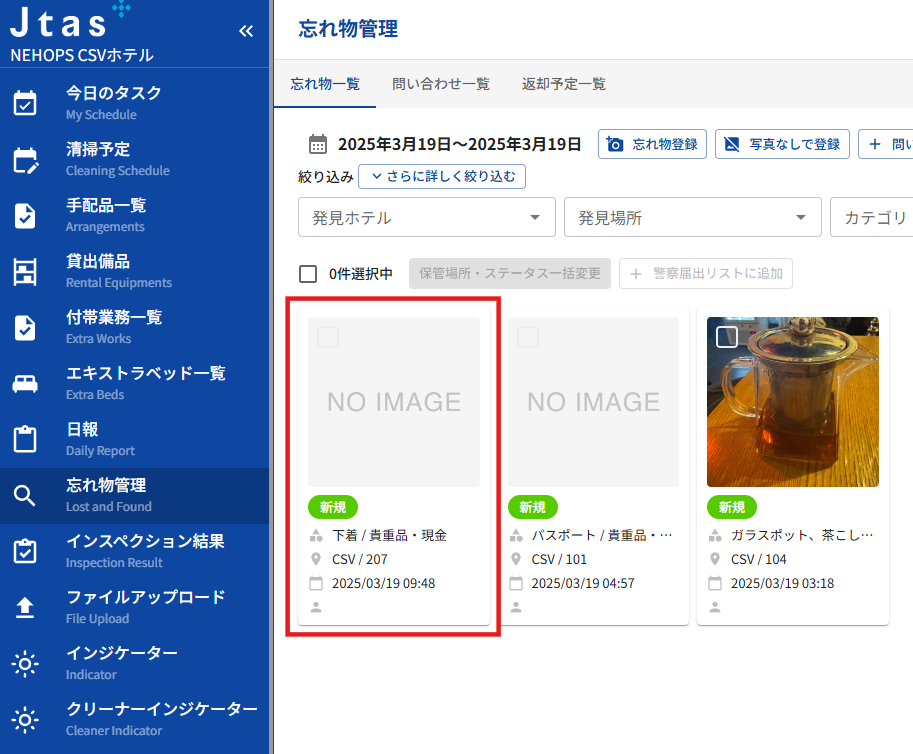 (ホテルユーザーでログインした「忘れ物管理」画面)