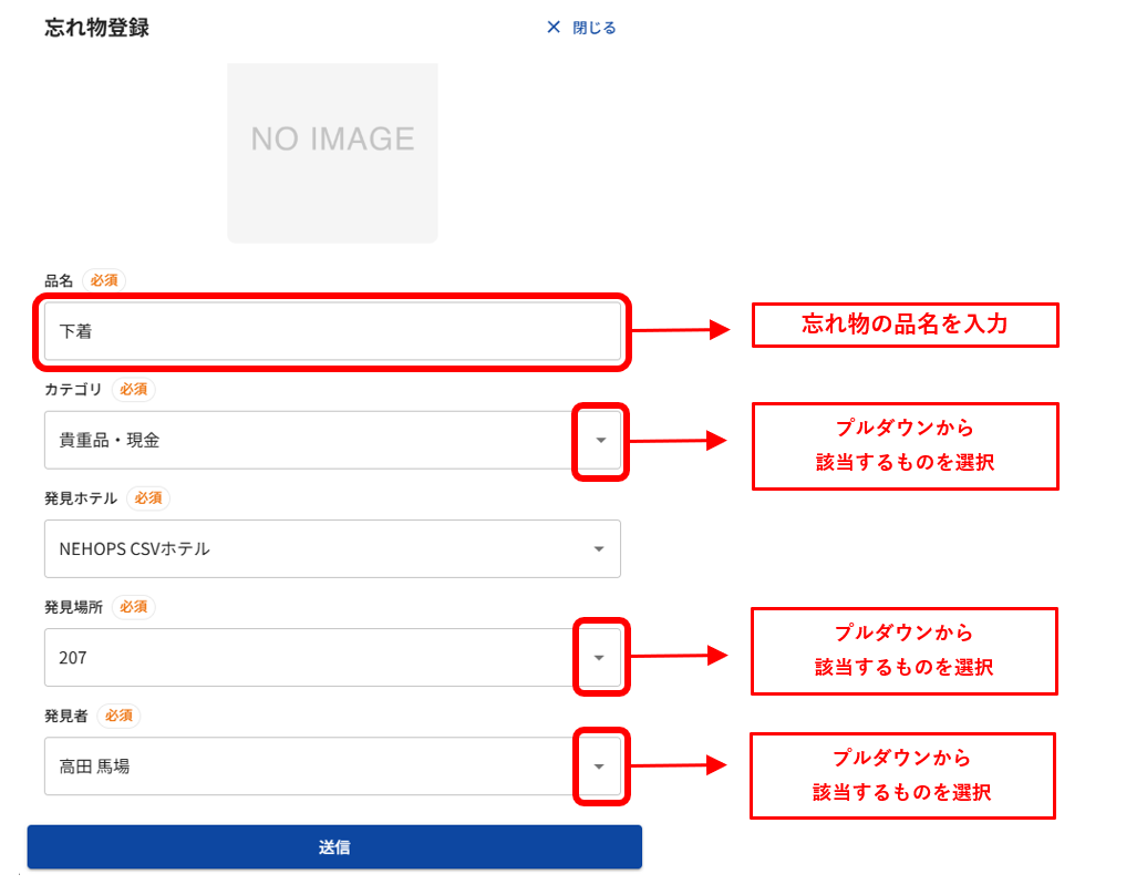 「忘れ物」ボタンを選択すると、写真の登録が求められるので、ご注意ください。