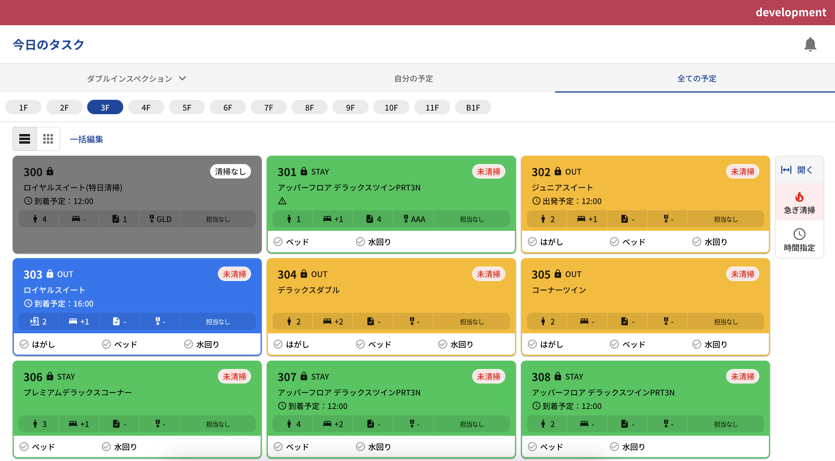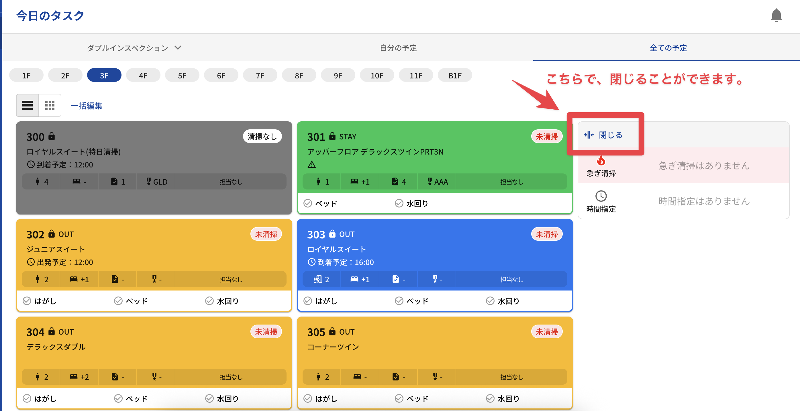 今日のタスク画面にて、急ぎ清掃やステイ清掃の時間指定がある場合は、別で表示するように変更しました。不要な場合は「閉じる」を押すことで、以前と同じ画面になります。