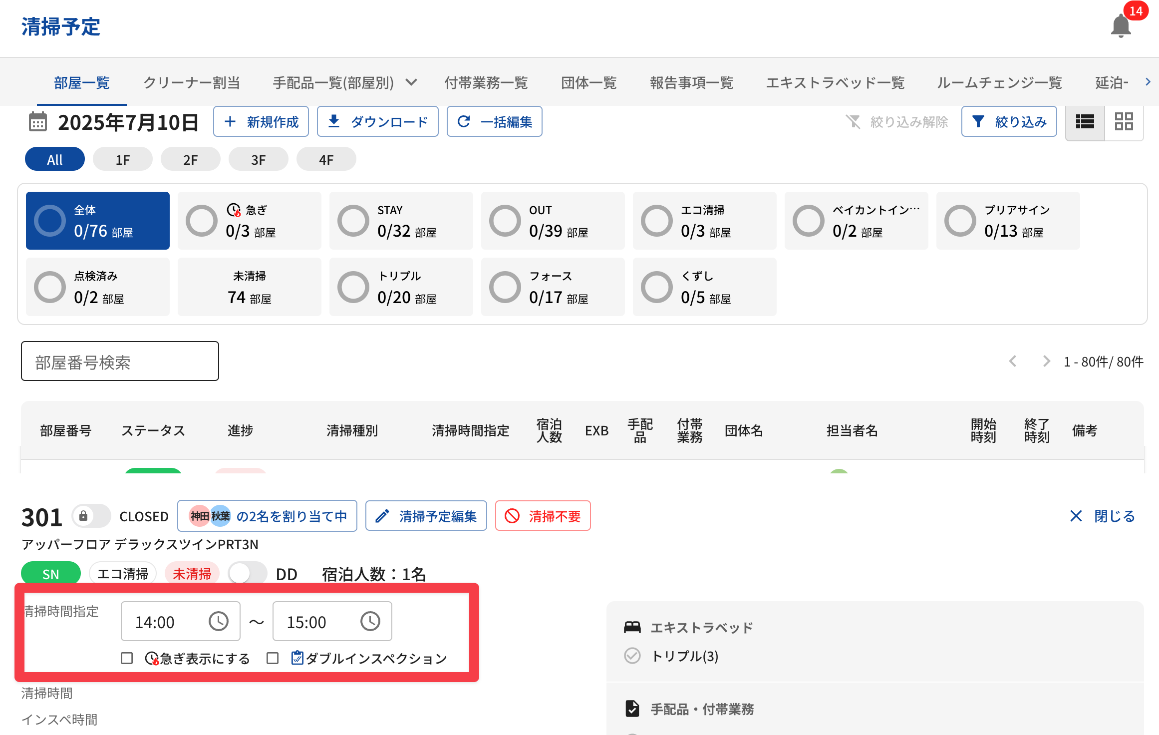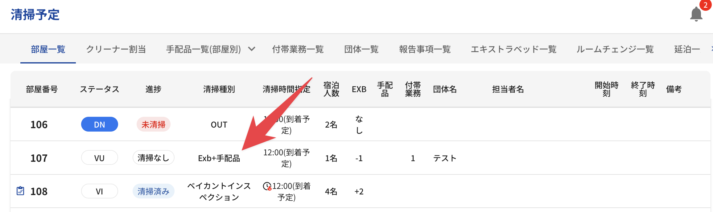 清掃予定作成時に、ベイカントで手配品やエキストラベッド作業がある場合において、作業があることを分かりやすくしました。