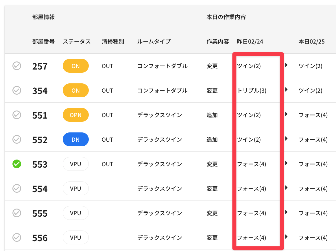 Jtasã§ã¯ãçŸåšã®ãããæ°ïŒç¶æ ïŒã管çããŠãããããã®äœæã厩ãã®æç€ºã«ãã£ãŠãæšæ¥ã𿬿¥ã®ãããç¶æ ã®Before/Afterã衚瀺ãããŸãã