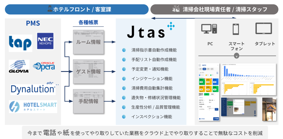 Jtasとは、ホテル・清掃会社間のあらゆるコミュケーションをデジタル化すると共に、