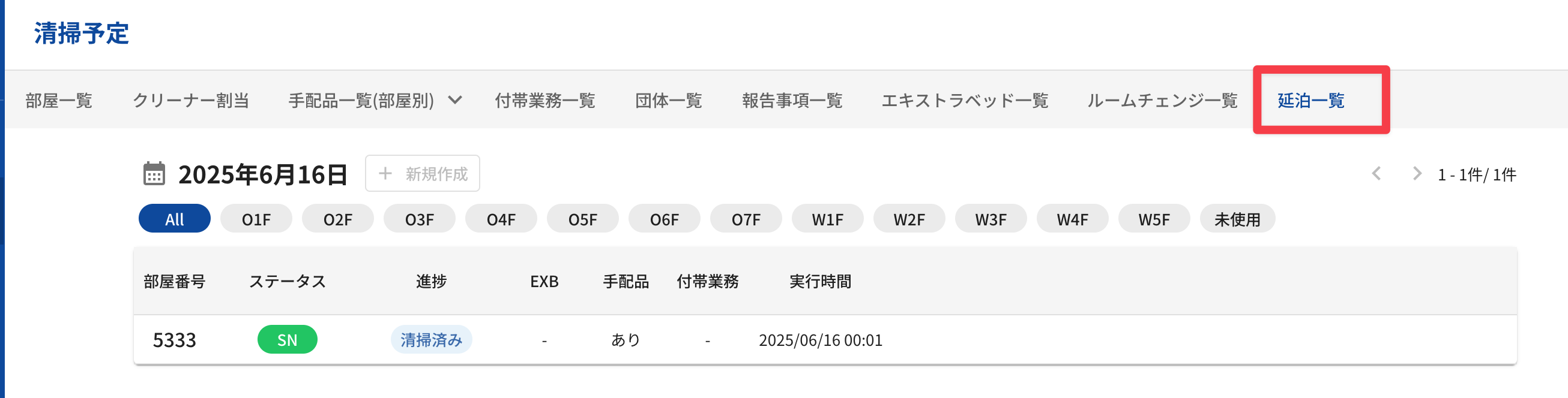 清掃予定作成前に延泊処理がなされるとステータスがSUとなります。