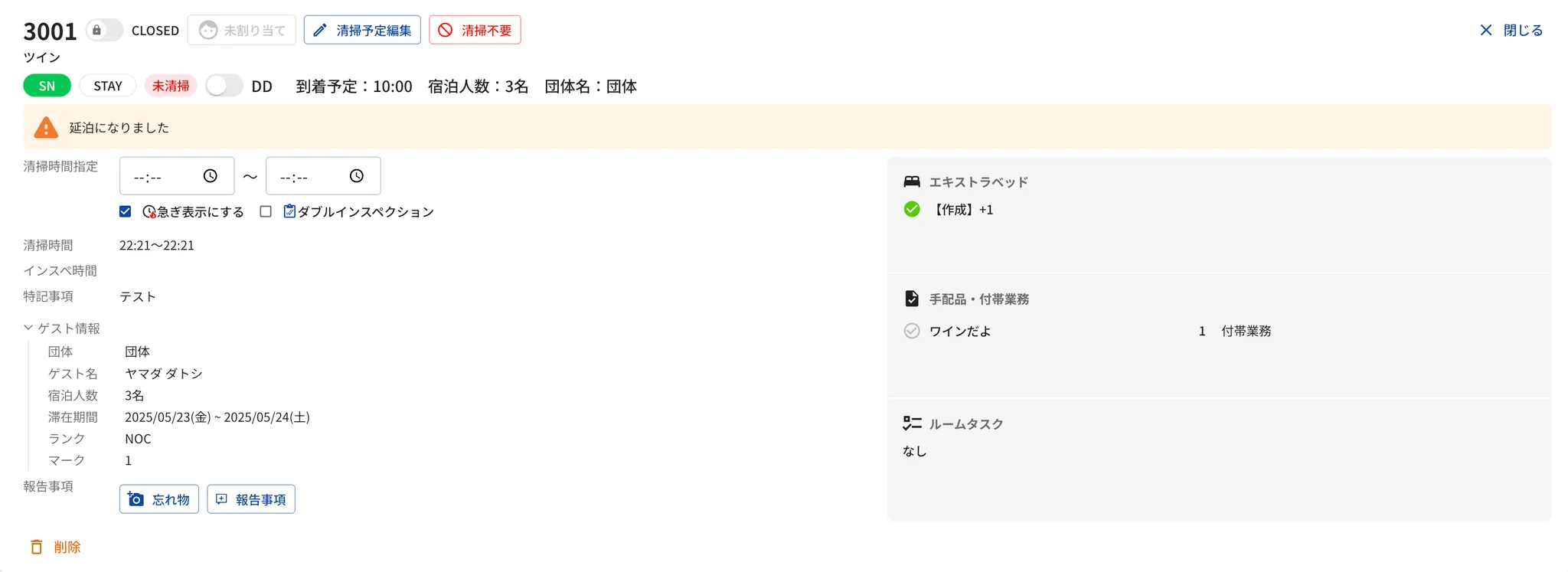 この場合も延泊処理されたと判定され、ステイ清掃の予定が作られます。