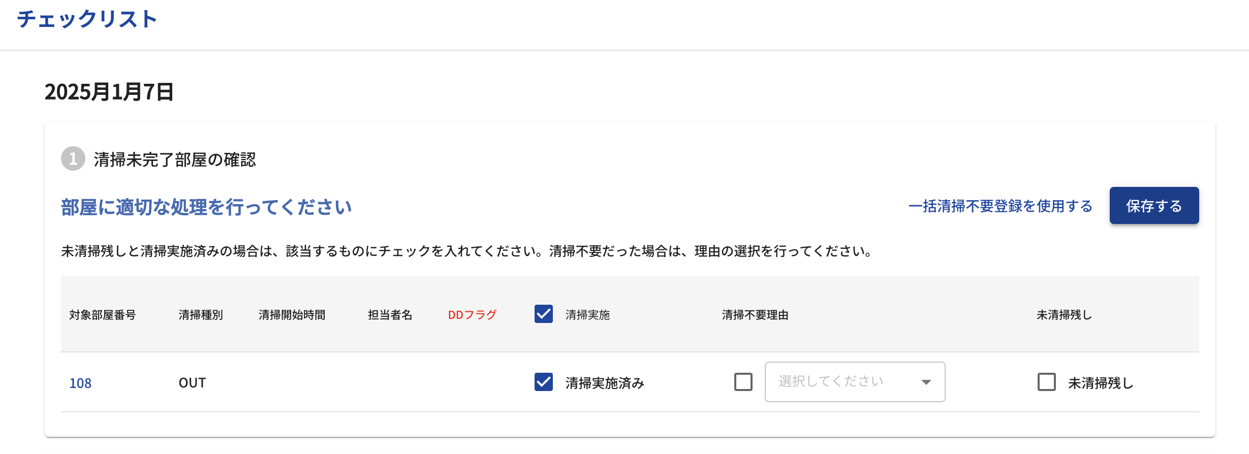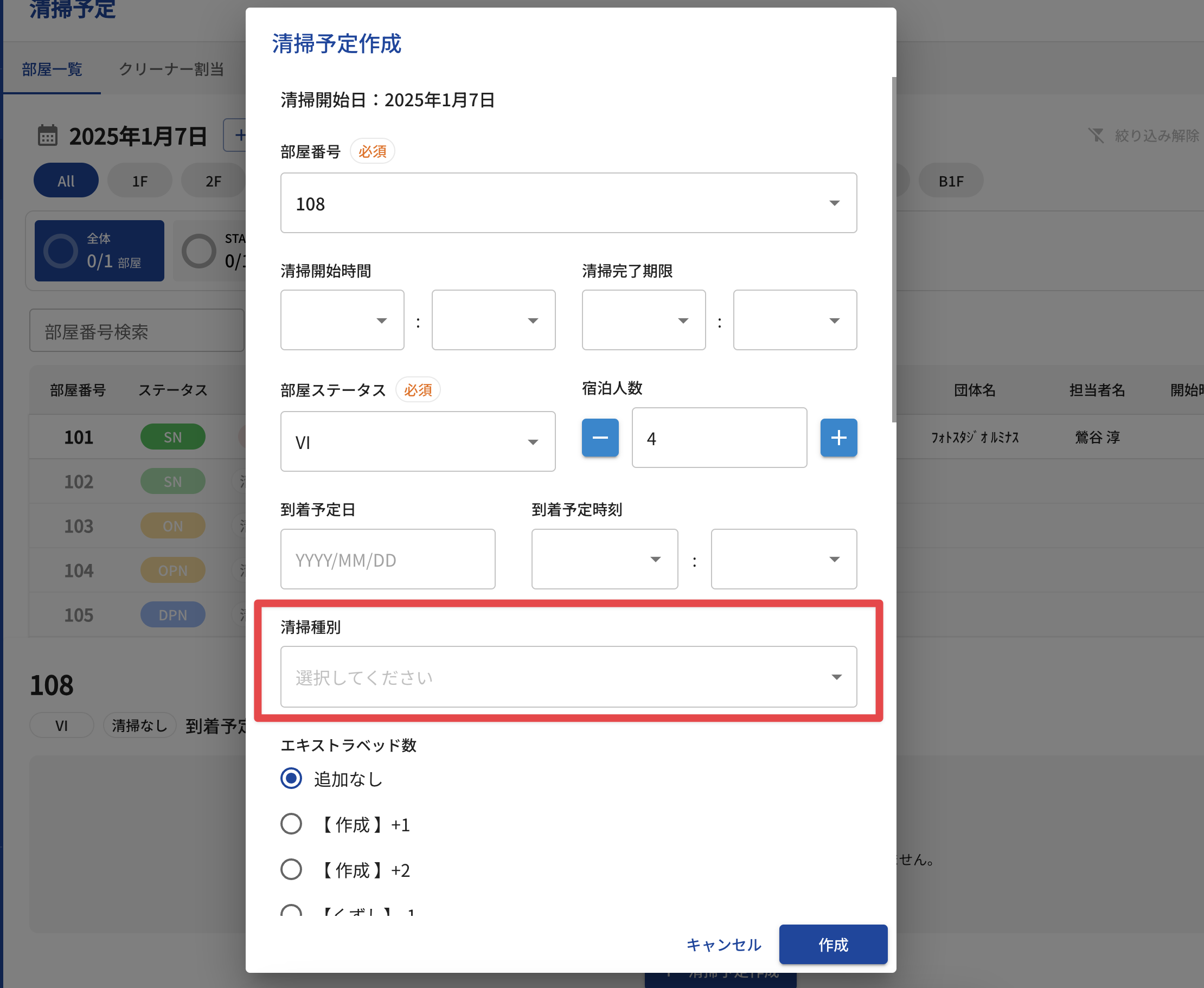 清掃が始まっている場合、出発予定(Depature)の清掃が終わっている(清掃完了でアップ状態)の可能性があります。この状態で清掃予定を作成しても清掃予定が作られません。