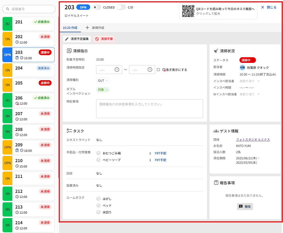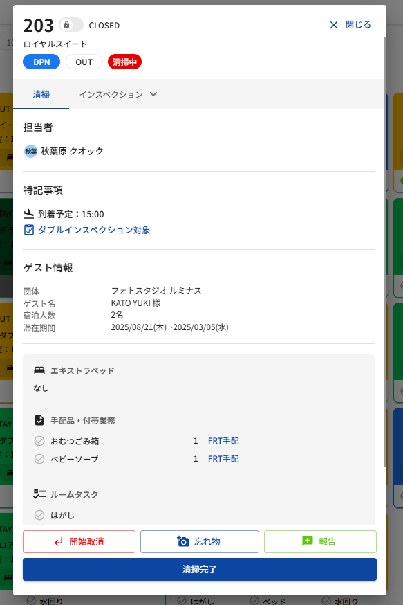 チェックイン日 | 滞在基本情報のチェックイン日 | 部屋詳細のゲスト情報に反映 |